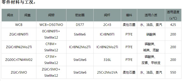 6、閥體材料品種齊全,填料、墊片可根據(jù)實際工況或用戶要求合理選配,能適用于各種壓力、溫度及介質(zhì)工況。